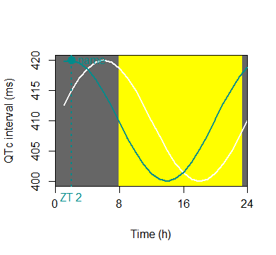 See the attached file for a quick R script for modelling a circadian rhythm of a heart QT interval rhythm – feel free to modify as you see fit.